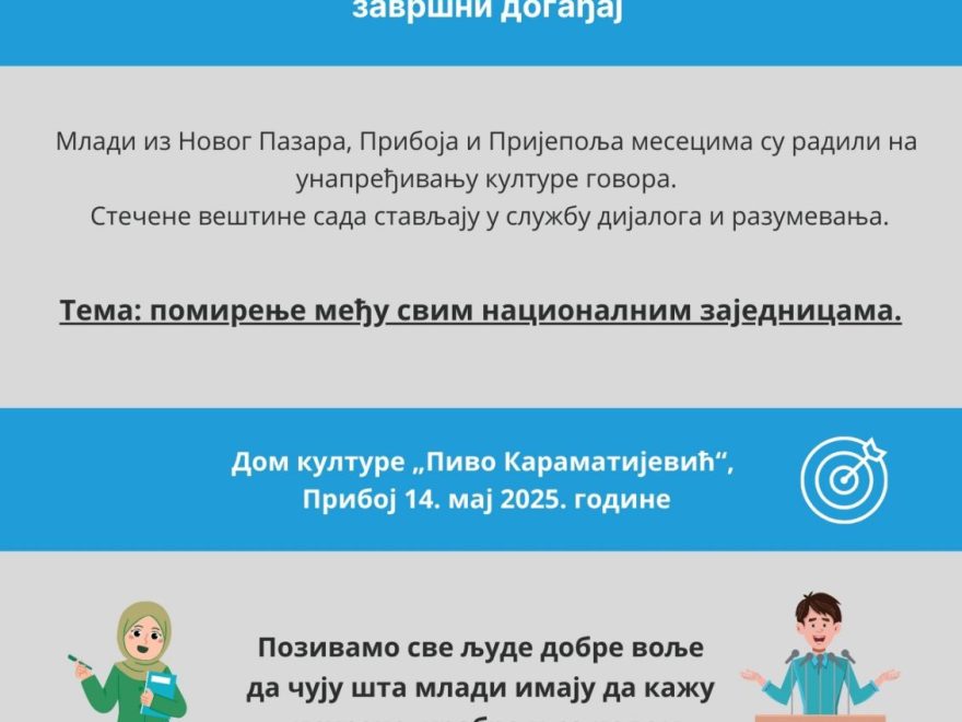 Придружите нам се на завршном догађају едукативних радионица „Глас помирења“, где ће млади из Новог Пазара, Прибоја и Пријепоља поделити